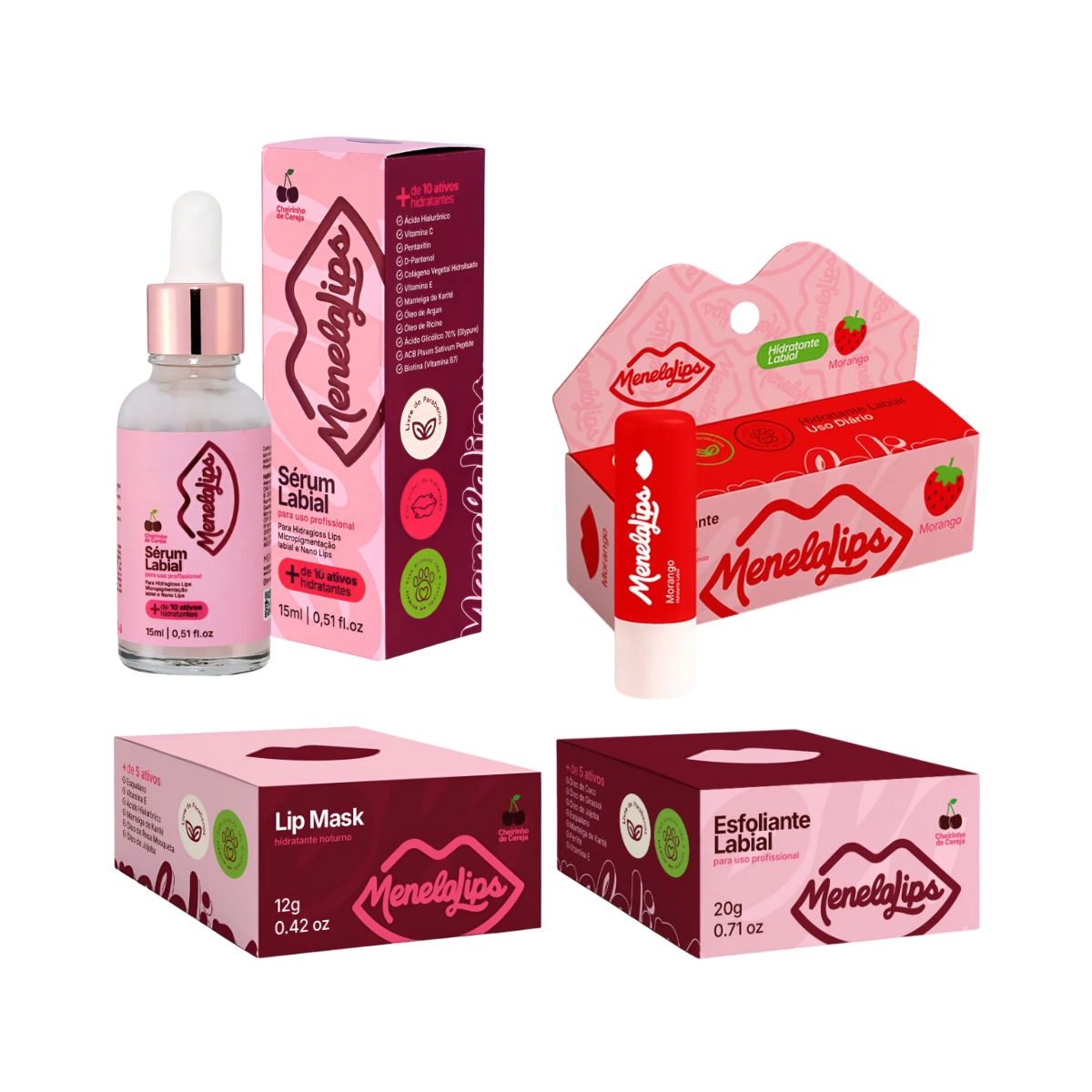 Kit Tratamento Labial MenelaLips — Lip Mask, Sérum Labial, Esfoliante e Hidratante Morango